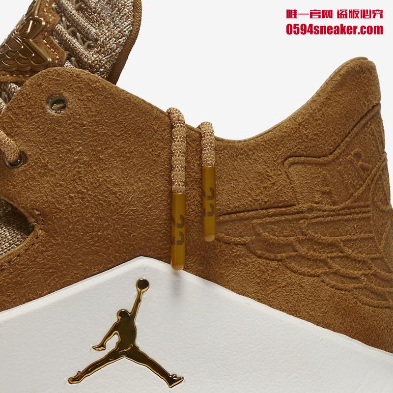 金色的 Air Jordan 32 Low “Wheat” 小麦低帮款,以 Flyknit 材质打造,而此款与其他配色不同的是后跟拼接为麂皮材质。虽可以归属于纯色鞋面,但其通过将金麦芒色、金属金色以及金砂色三种不同色调的金组合起来,营造出极为奢华视觉的感受!再搭配上金属质感的金色 Jumpman 飞人的中底外侧 Logo 以及淡米色水晶外底。