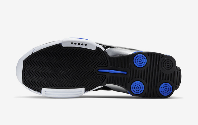 中底外露式 Shox 气柱同样采用蓝色装点。在黑白主色衬托下格外亮眼。
